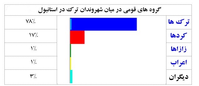 کردها با تخمینها از 2 تا 4 میلیون نفر یکی از بزرگترین اقلیتهای قومی استانبول را تشکیل میدهند و بعد از ترکها بزرگترین گروه در بین شهروندان ترکیه هستند. بر اساس یک مطالعه KONDA در سال 2019 ، کردها حدود 17٪ از کل جمعیت بزرگسال استانبول را که شهروند ترکیه بودند تشکیل می دادند. اگرچه حضور اولیه کردها در این شهر به اوایل دوره عثمانی برمی گردد، اما اکثریت کردهای این شهر از روستاهای شرق و جنوب شرقی ترکیه سرچشمه می گیرند. زازاها نیز در این شهر حضور دارند و حدود 1 درصد از کل جمعیت در سن رای را تشکیل می دهند.